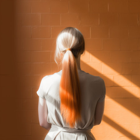 a girl with orange hair stands in a hallway with an orange wall behind her. the photo is styled with backlighting, colorist techniques, and a sparse use of color. the light silver and light brown tones create a color-blocked effect. the composition is tightly cropped, reminiscent of the washington color school. ai generated