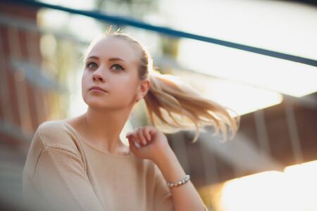 Portrait of happy smiling woman standing on the square on sunny summer or spring day outside, cute smiling woman looking at you, attractive young girl enjoying summer, filtered image, flare sunshine.