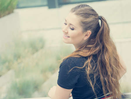 Happy teen woman enjoying her leisure time. Female having long brown hair posing with big smile