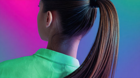 A ponytail flows gracefully against a vibrant gradient backdrop, capturing the essence of movement and artistic expression during a dynamic moment.