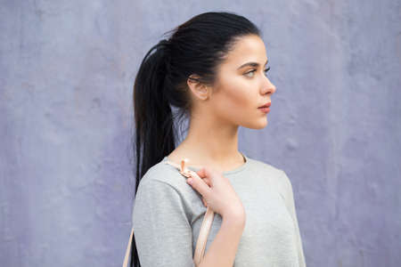 Stylish pretty woman with bag against a violet wall background