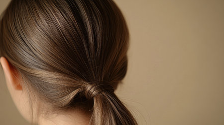 A closeup of smooth brown hair styled in a simple ponytail, showcasing the natural texture and elegance. Perfect for beauty and fashion themes.