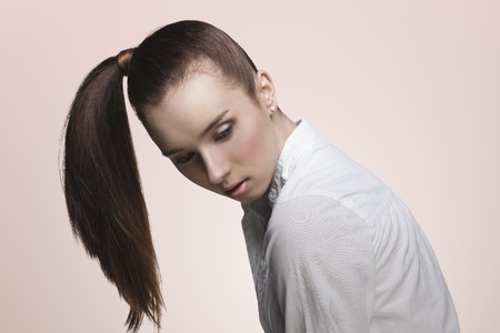 sensual young girl with brown ponytail hairstyle on the right, pretty make-up wearing white shirt