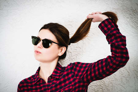 portrait of a young girl wearing trendy glasses and casual shirt and posing. hipster style.