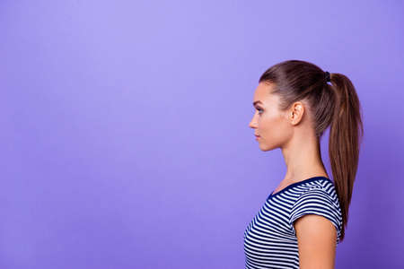 Profile side view photo charming nice pretty lady have thoughts intelligent genius future entrepreneur ready solve decide choose ponytail fashionable spring youth outfit isolated violet background