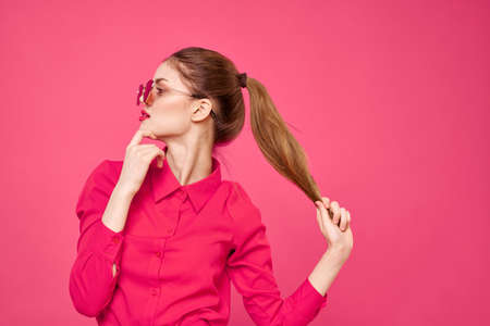 Woman in pink shirt and brown glasses cropped view fashion model emotions gesturing hands portrait