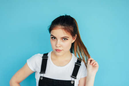 Beautiful thoughtful girl with dark long hair in white t-shirt isolated on the blue background