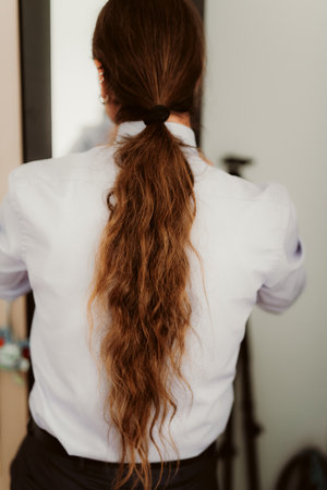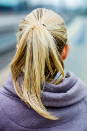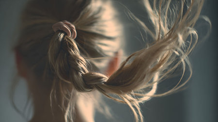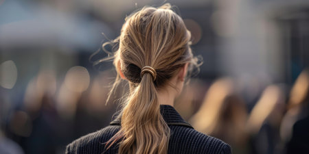 Close-up of a blonde ponytail hairstyle with sunlight, creating a warm and artistic image. Back view.