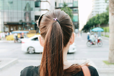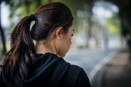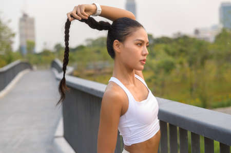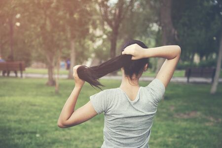 Back view - Beautiful asian woman tying hair at the back.