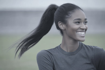 A young female athlete with a long ponytail is smiling brightly while engaging in training at a vibrant sports field during daylight hours, conveying happiness and confidence.