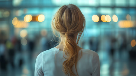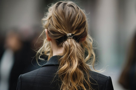 A woman stands with her back turned, showing her long, elegantly styled hair pulled into a sleek ponytail. The dark backdrop creates a striking contrast, emphasizing the light tones of her hair. It captures a moment of simplicity and grace, exuding an air of calm and confidence.