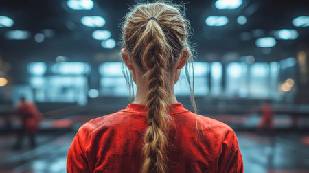 A confident young female boxer wearing red gloves and a sports bra, intensely focused, standing in an atmospheric gym setting with soft natural lighting.