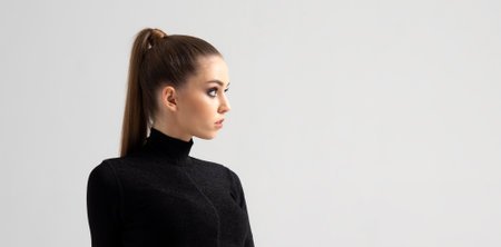 Fashion portrait of beautiful young woman with ponytail hairstyle. Pony tail straight hair, eyeliner makeup