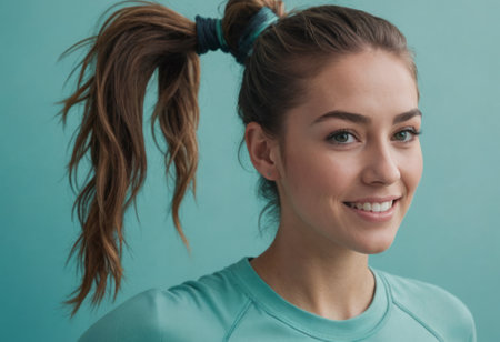 An active woman with a ponytail in fitness gear, showcasing a healthy lifestyle with a teal backdrop.