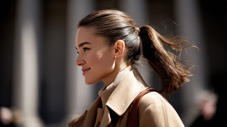 A stylish young woman with a ponytail is captured in profile, exuding confidence as she strolls through an urban environment on a sunny day.