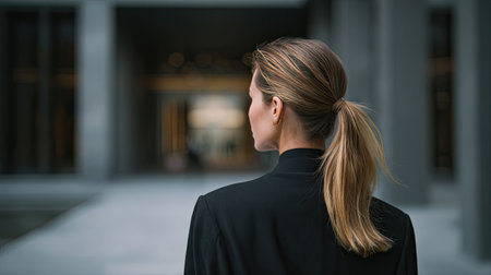 A professional woman stands confidently with her back facing the camera, embodying ambition in an urban landscape. The modern architecture and serene atmosphere reflect a focus on career and personal growth.