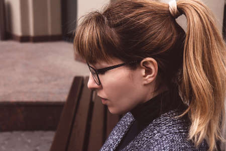 Serious, young businesswoman in glasses, in a cozy gray-blue vest spends time outdoors in the city. Lifestyle portrait of girl. Close up