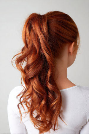 A woman with long red hair has her hair in a ponytail. The ponytail is curled and has a lot of volume. The woman is wearing a white shirt