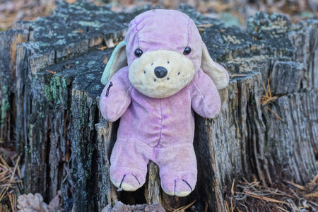 one small plush purple white toy dog stands on a gray wooden stump