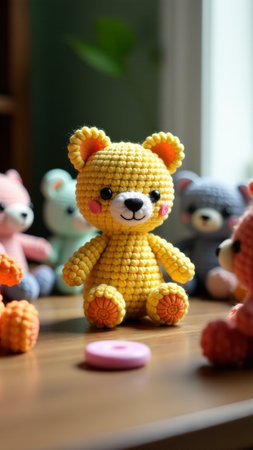 Colorful crochet teddy bears on wooden table.
