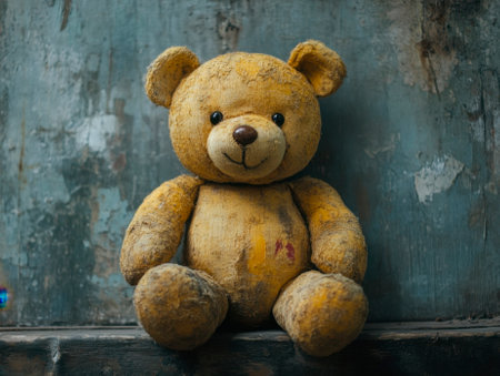 Classic teddy bear with button eyes, sitting alone on an empty wooden bench generative ai