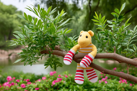 Knitted monkey toy enjoying a relaxing day sitting on a tree branch in a beautiful garden with pink flowers and a pond