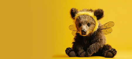 A plush toy of a baby bear in a bee costume with wings, designed for an art event. The carnivorous terrestrial animal figure is sitting on a yellow background
