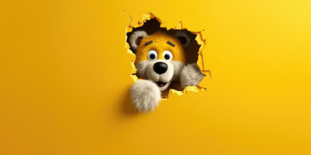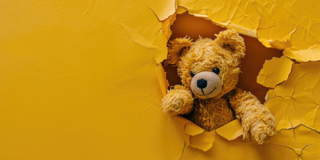 Cute Teddy Bear peeking out of a hole in wall, torn hole, empty copy space frame, mockup. Generative AI image weber.