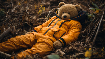 Teddy bear lying on the ground in the autumn forest. The concept of loneliness and depression.