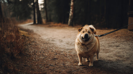 Cute fat dog sad because of excess weight. Modern problem of obesity in pets due to overfeeding with food and treats. Concept of diet and fight against excess weight in dogs and awareness of animal health.