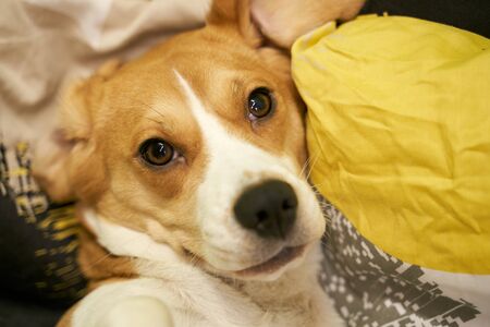 Beagle lying in bed blanket pillow preparing bed