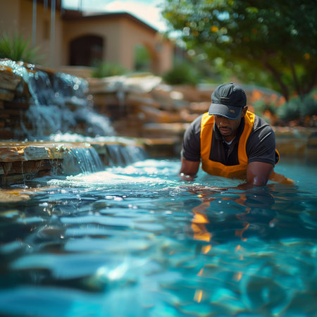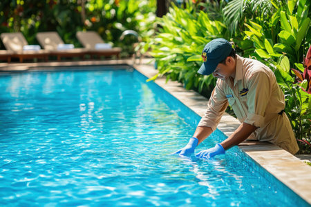 Pool maintenance worker wearing gloves checking water quality in a swimming pool during a sunny day