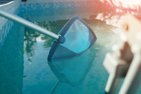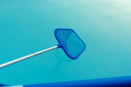 High angle top view of cleaning swimming pool of fallen leaves with skimmer net tool. Mesh equipment with foliage lying on poolside against transparent clear water with copy space
