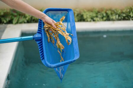 Cleaning swimming pool of fall leaves with cleaning net in the morning