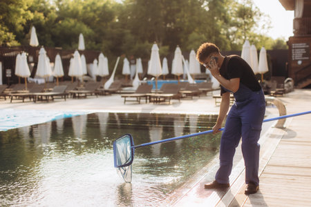 Pool cleaner using a landing net to remove leaves and debris while talking on a mobile phone, ensuring hygiene and maintenance in a sunny resort setting