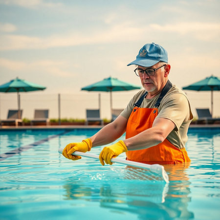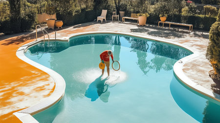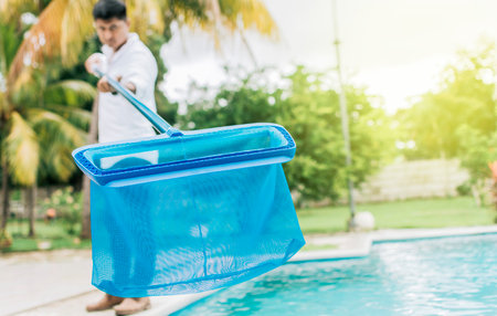 Pool cleaner standing by the poolside, holding a cleaning net, ensuring hygiene and maintenance of the swimming pool