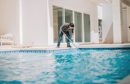 A young man cleans the swimming pool with a vacuum in a sunny backyard during a summer afternoon