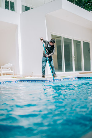 Maintenance man cleaning swimming pool with vacuum suction hose. Worker cleaning a beautiful swimming pool with suction hose