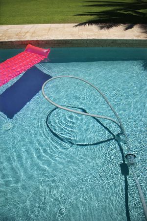 Pink float and vacuum hose in swimming pool.