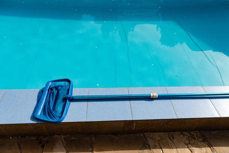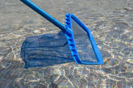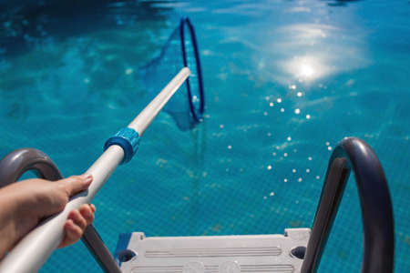 Cleaning pool from garbage with special net. Services of cleaning service company. Clear water with blue tint. Concept of hygiene and healthy lifestyle. Horizontal photo. Close-up. Selective focus.