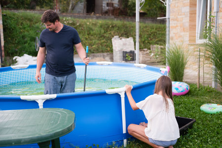 A man and a young girl are cleaning a dirty, algae-filled above-ground swimming pool in their backyard. The pool water is green, and they appear to be using pool cleaning tools.