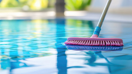 A vivid scene capturing a pool cleaning process, showcasing a modern brush gliding through clear, sparkling water in a tranquil outdoor setting, ideal for relaxation.