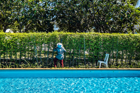 Gardener cutting green bush at swimming pool