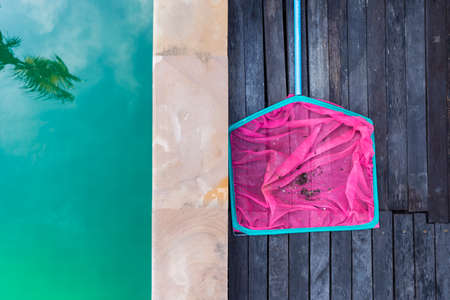 Dirty in pink net from swimming pool, pool maintenance and service during summer season, pool water problem algae growing fast, green pool, tropical climate
