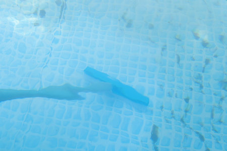hand in white glove cleaning blue swimming pool with squeegee and sponge
