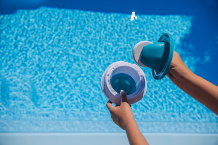 Hands holding a floating pool dispenser with chlorine tablet above clear blue water, illustrating summer pool sanitation and maintenance