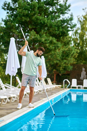 Pool cleaner during his work. Caucasian hotel staff worker cleaning the pool