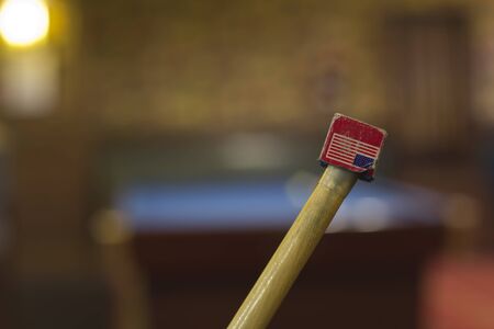 Billiard cues on the rack. Billiard game equipment. Wooden cues for table game. Billiard competition or championship. Cue stick shaft tapering. Maple wooden sticks for billiard playing