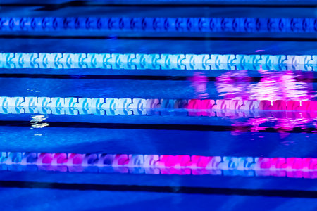 Gliding two swimmers performing laps in competition pool, with swim caps and lane dividers. Athletes, sports, aquatic, competitive, fitness, training, splash