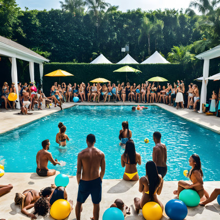 Diverse group of friends having fun in swimming pool. Hanging out and relaxing outdoors in summer.